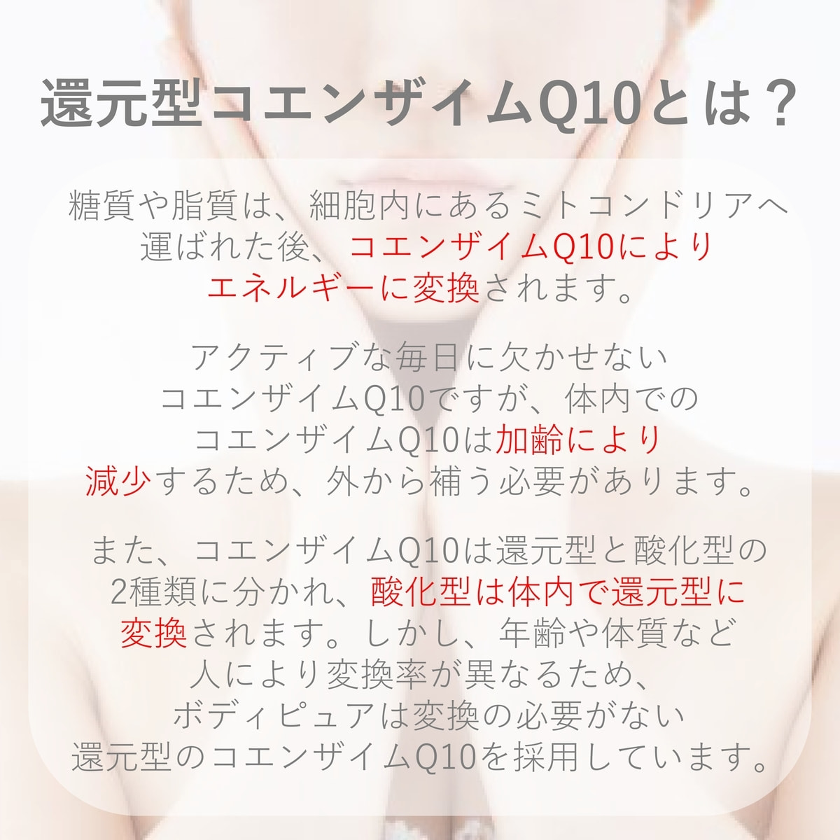 酸化型のコエンザイムQ10は体内で還元型に変換する必要がありますが、還元型コエンザイムQ10なら素早く働きます。